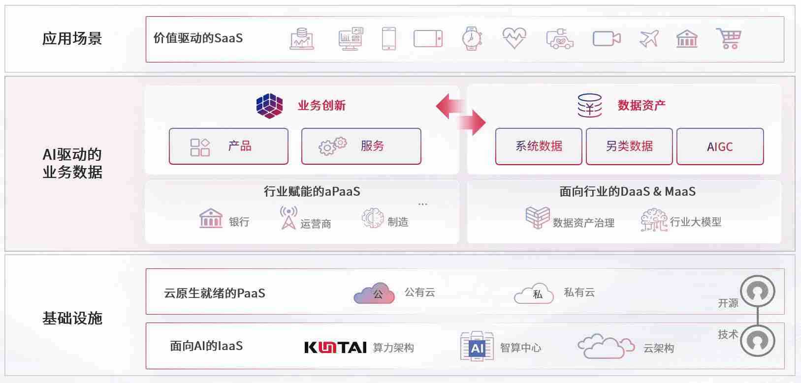 数字时代,,围绕企业数字化转型的关键要素,,,,恒盛娱乐数码开创性的提出数云融合战略和技术体系框架,,着力在云原生、、数字原生、、、AI原生和信创产业上架构产品和服务能力,,,,为处在不同数字化转型阶段的快消零售、、、、汽车、、、金融、、、、医疗、、、、政企、、、教育、、、运营商等行业客户提供泛在的敏捷IT能力和融合的数据驱动能力,,构建跨界融合创新的数字业务场景和新业务模式,,,助力企业级客户建立面向未来的核心能力和竞争优势,,,全面推动社会的数字化、、、智能化转型升级。。。