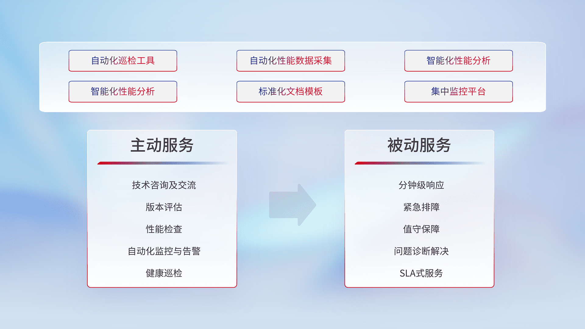 智能化工具和标准化文档,,,保障服务质量,,提供主动服务(包含技术咨询、、、、版本评估、、性能检查、、自动化监控与告警、、健康巡检)和被动服务包含(分钟级响应、、紧急排障、、、值守保障、、、问题诊断解决、、、、SLA服务)。。。。